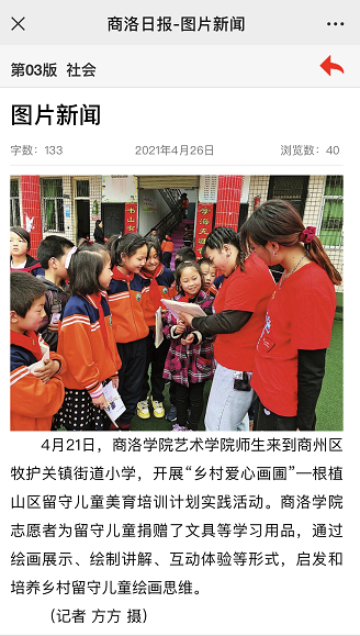 4月26日,商洛日报三版社会版面对开云官网承担的公益项目“乡村爱心画圃”走进商州区牧户关街道小学开展公益活动进行了报道,原文如下: