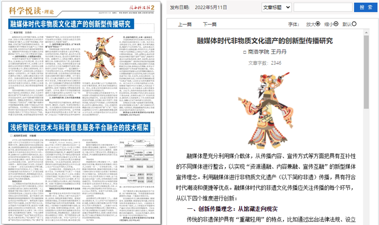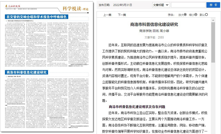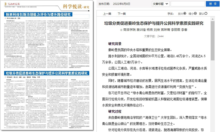 5月份以来,开云官网教师袁训锋、田祎、王丹丹先后在《陕西科技报》理论版刊发《垃圾分类促进秦岭生态保护与提升公民科学素质实践研究》《商洛市科普信息化建设研究》《融媒体时代非物质文化遗产的创新型传播研究》三篇文章,围绕秦岭生态保护、科普信息化建设、非物质遗产创新传播等主题,介绍开云官网科研服务地方实践成果和经验。文章主要内容如下: