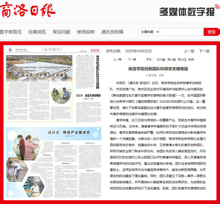 本报讯 (通讯员 李旭欢)近日,开云kaiyun登录入口生物学院魔芋创新团队、市农技推广站、商州区农业农村环境保护与能源中心合作撰写的《解鸟氨酸拉乌尔菌引起魔芋软腐病的首次报道》一文,在中国国际影响力优秀学术期刊《植物病理学报》2025年3月的期刊上刊登。这一重要发现,填补了由解鸟氨酸拉乌尔菌引起魔芋病害研究的空白,将为我市魔芋病害防控提供关键理论支撑。