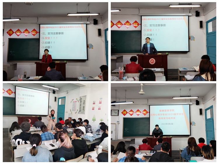 根据开云官网毕业生实习相关要求和学院工作安排。4月2日,健康管理学院召开应用心理学专业2023届毕业生教育实习动员会,62名实习生将奔赴商洛中学、商洛市小学等7所中小学校,开展为期12周的教育实习。党总支书记鲁绵茸出席会议并讲话,实习指导教师、辅导员、2023届应用心理学专业全体毕业生参加动员会,会议由心理学系主任梁丰主持。