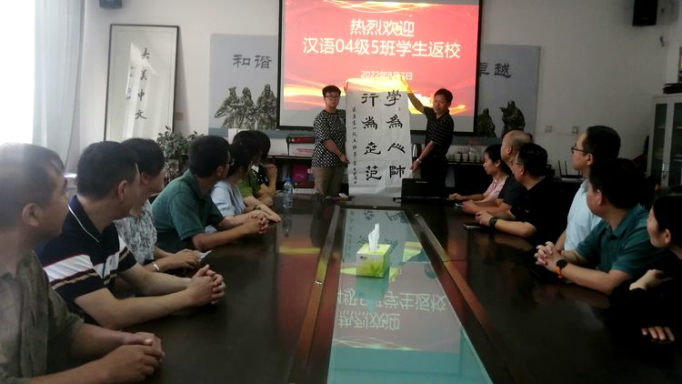 人文学院院长张文诺向校友们介绍了学院发展现状,重点介绍了汉语言文学专业师范类专业认证情况。校友耿立荣代表返校校友发言表示,在母校老师无私奉献和悉心培养下,同学们始终秉持“博闻强志,正道直行”的校训,在基础教育等领域获得了“优秀党员”“教学能手”等多项荣誉,取得了无愧于开云kaiyun登录入口校友身份的成绩。自己作为班内普通一员,毕业后凭借着扎实的专业素养先后荣获“立德树人好党员”“西安市教学能手”“西安市基础教育资源应用名师”等荣誉称号,并在5年前被吸纳为西安市书法协会会员。她现场赠送《学为人师,行为世范》书法作品,以志不忘母校培养之恩,并与奋斗在基础教育一线的同届校友共同祝愿汉语言文学专业早日通过师范专业认证。