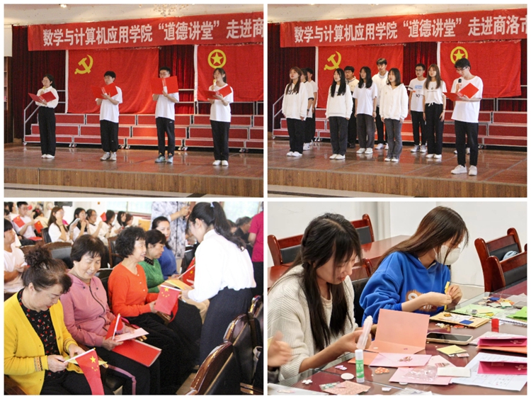 本次道德讲堂由唱一首歌曲、讲一个故事、诵一段经典、作一个承诺、送一份吉祥五个环节组成。活动在数计学院学子带来的团体操表演《盛夏光年·心国旋律》中拉开了帷幕,郝雅馨、肖茹丹等10位同学合唱并表演了手语操《感恩的心》,号召大家常怀感恩之心;杨夏懿同学讲述了丹凤县龙驹初级中学彭莉老师尊老爱老的美德故事,全体学生进行了《尊老爱老》承诺宣誓,并向在场的爷爷奶奶们送上了亲手制作的精美贺卡。老年大学的爷爷奶奶们也为青年学子带来了《久别的草原》《十送红军》等经典曲目,将活动气氛推向高潮。活动最后在全场观众齐唱《我和我的祖国》中落下帷幕。