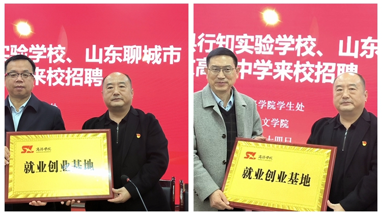 会上,杜明生代表人文学院与湖北房县行知实验学校、聊城市汇文高级中学分别签订了就业创业基地协议并进行了授牌。