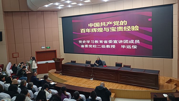 毕远佞简要介绍了自己的求学岁月、工作经历以及研究党史的基本思路和方法。他表示,高校教师承担的责任和肩负的使命很重要,应该坚持读原著、学原文、悟原理,自觉树立正确的党史观,坚定历史自信,增强历史主动,积极引导学生形成正确的世界观、人生观、价值观。此外,要坚持理论武装同常态化长效化开展党史学习教育相结合,做到学史明理、学史增信、学史崇德、学史力行。毕远佞紧密围绕中国共产党的奋斗历程、宝贵经验、学习党的历史践行初心使命三个方面展开讲解。他讲到,《中共中央关于党的百年奋斗重大成就和历史经验的决议》将中共党史划分为四个历史时期,每个时期都承担着重要的历史使命和任务。在一百多年的奋斗历程中,中国共产党形成了坚持党的领导、推动理论创新、坚定“四个自信”、勇于“自我革命”等一系列宝贵经验。在新时代背景下,应该继续坚定理想信念,用党的创新理论武装头脑、指导实践和推动工作,着力解决人民群众急难愁盼问题。