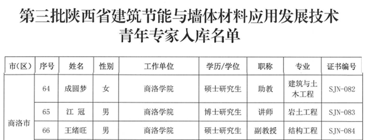 近日,陕西省建筑节能与墙体材料发展中心公布了第三批陕西省建筑节能与墙体材料应用发展技术“青年专家”选聘结果,建工学院王绪旺、江冠、成圆梦3位教师受聘为陕西省建筑节能与墙体材料应用发展技术“青年专家”。
