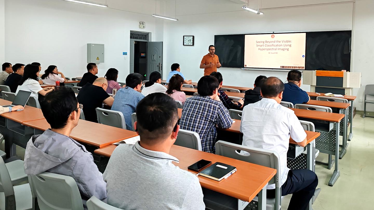 报告中,Youcef HM介绍了高光谱成像(HSI)技术,他指出高光谱成像技术能够捕捉远超人眼感知范围的详细光谱信息,为农业、遥感和环境监测等领域开拓了新路径。结合自己的研究内容,针对现有不足等问题,提出了基于人工智能的解决方案,并通过数据集和分类图谱展示了方法的有效性。问答环节,YoucefHM博士同在场教师展开了深入交流,现场气氛活跃。