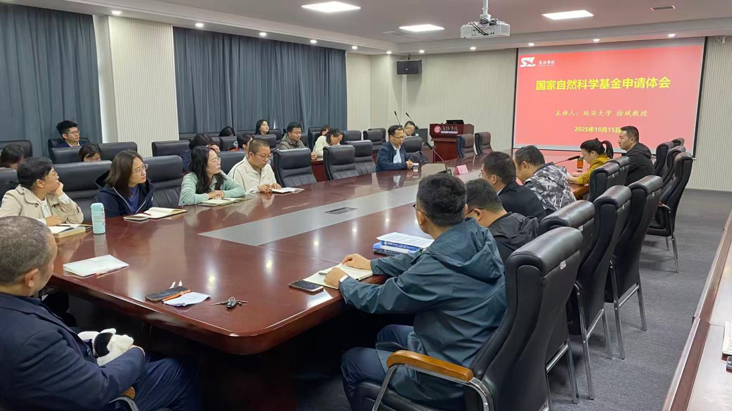 10月15日上午,化材学院举办国家自然科学基金申请专题报告会暨2026年国家自然科学基金申报启动会,特邀教育部“长江学者奖励计划”特聘教授、延安大学和北京化工大学博士生导师徐斌作报告。会议由化材学院院长曹宝月主持。化材学院2026年国家自然科学基金申请人参加会议。