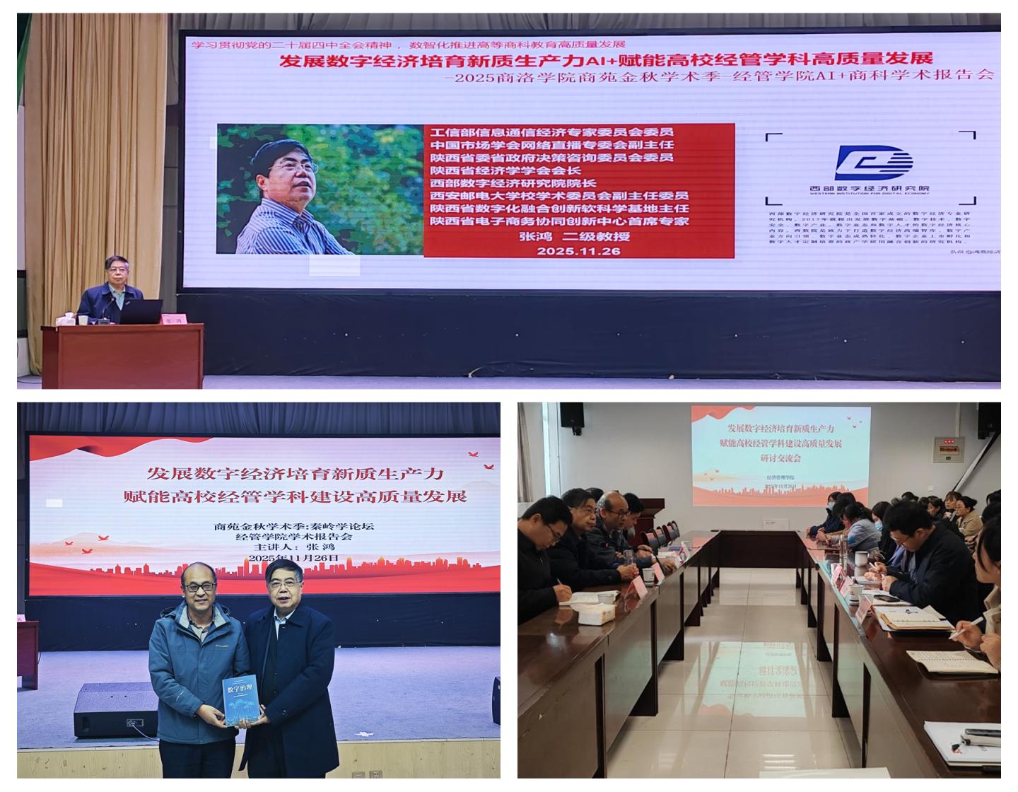 11月26日,经济管理学院在大学生活动中心举办专题学术报告会,西安邮电大学张鸿教授应邀为学院师生作《发展数字经济培育新质生产力赋能高校经管学科建设高质量发展》专题报告。学院班子成员、全院教职工及2025级全体学生参加了报告会。