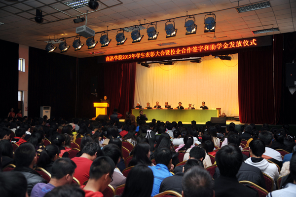 11月20日,开云官网隆重举行2013年学生表彰大会暨校企合作签字和助学金发放仪式。校党委书记张景书、院长刘建林、党委副书记左晓民、副院长魏书堂,商洛供电局党委书记陈飞、纪委书记杨军,商洛市邮政局局长王伟、调研员王林出席大会。各系各相关部门负责人、获奖学生及学生代表参加大会。会议由左晓民主持